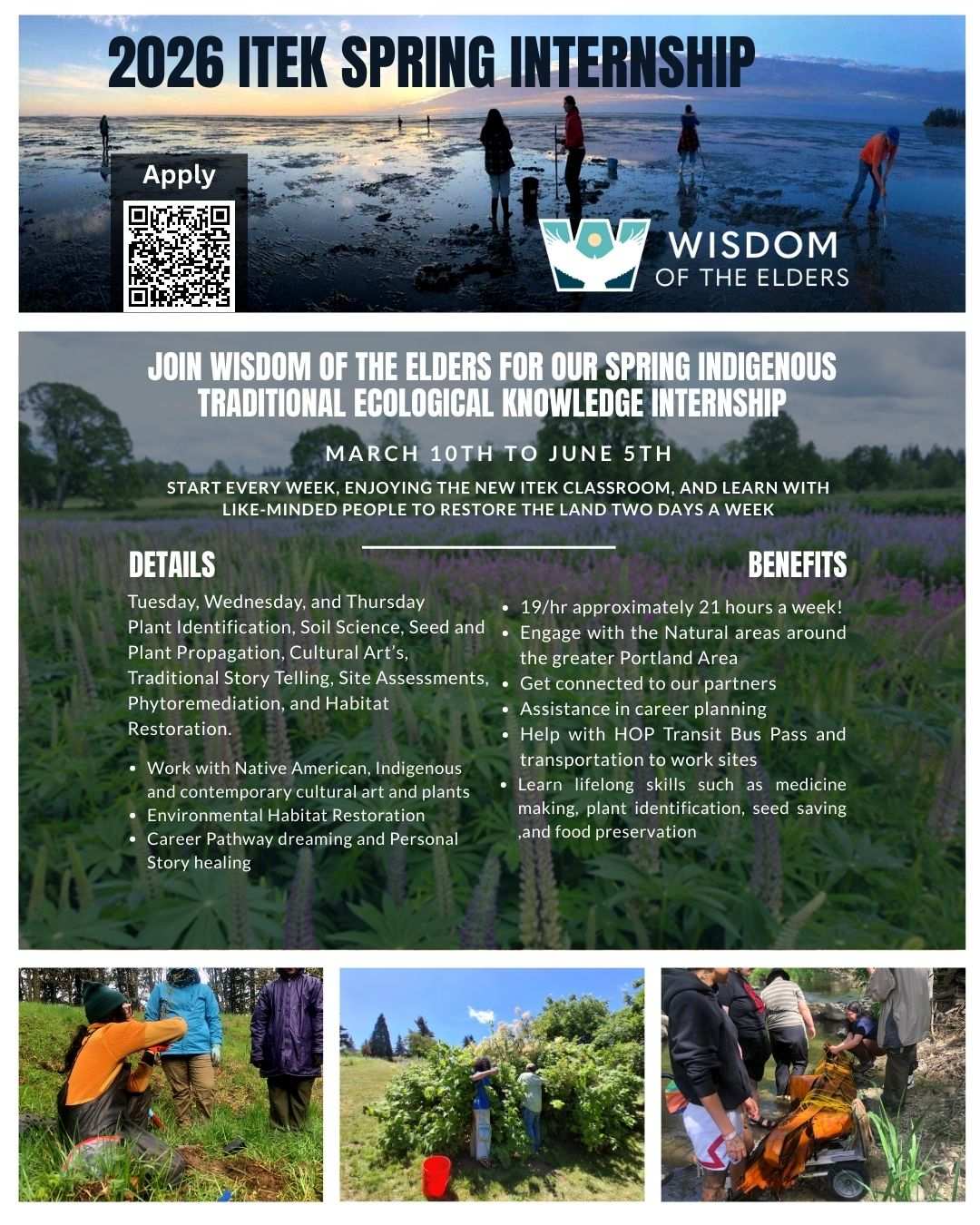 Paid internship opportunities for indigenous and underrepresented communities in the Portland area. Apply TodayWe are recruiting for our 2026 Spring ITEK internship. If you are interested in receiving updates about our internship, please contact dawn@wisdomoftheelders.org